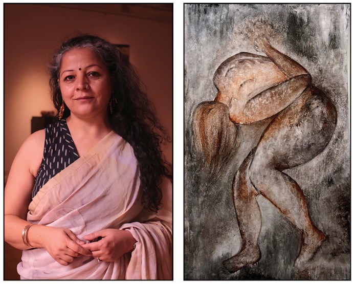 Bharti’s figurative practice unfolds as a quiet, resonant inquiry into the emotional life of the human body. Her paintings are not portraits of individuals but threshold spaces where the figure becomes a vessel for memory, vulnerability, endurance, and inward reflection. Faces are often veiled or absent, and gender dissolves into ambiguity, allowing the body to stand for a shared human presence rather than a fixed identity. The personal opens into the collective, and the figure becomes a bridge between private emotion and universal experience.