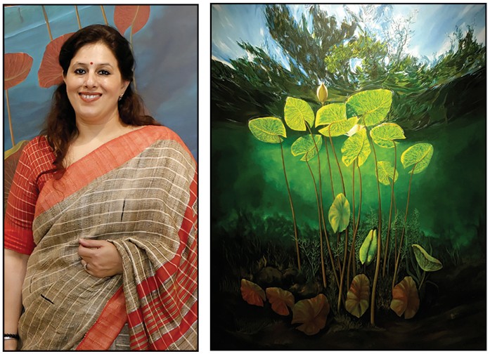 Delicate leaves and slender stems ascend through shadow toward illumination, symbolizing hope, courage, and perseverance. Rooted in silt yet reaching for light, the lotus emerges as a powerful emblem of resilience and renewal. Through layered textures and tonal contrasts, Ruchi invites viewers into an immersive, contemplative space. Her works evoke stillness and inner strength, leaving a lasting impression of harmony, endurance, and the quiet triumph inherent in nature’s cycles.