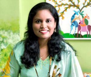 Highly inspired by vivid colours, graceful forms and intricate detailing in Kerala mural paintings , each of her work is both a visual celebration and a meditative experience.