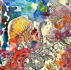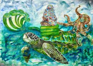 A U.S.-based Indian contemporary artist with roots in fine arts, textiles, and graphic design, Sanghani reimagines the ancient myth of Samudra Manthan as a modern ecological parable. In her retelling, the divine churning of the cosmic ocean no longer yields celestial treasures—it dredges up the bitter harvest of human negligence: plastic, toxins, and irreversible loss.