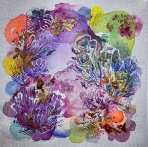 Her mixed-media works echo both devotion and desecration. In The New Manthan, a sea turtle journeys across swirling waters as serpents and sea creatures maneuver through surreal mounds of plastic refuse, evoking a world where mythology reels under man-made disaster. In A School of Fish, glistening silver bodies twist among disposable bottles, locked in a frantic dance for survival. Sanghani’s artistic technique—lush, overflowing, almost seductive—draws viewers closer before confronting them with the brutality beneath.