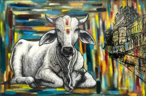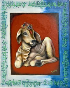 Ashish Mundhra is a devotional and spiritual artist based in Ahmedabad, India, working primarily with oil on canvas. His art is a heartfelt expression of faith, culture, and inner devotion, where colour becomes a language of spiritual emotion. Gau Mata holds a central place in his work, symbolising purity, abundance, and divine grace.